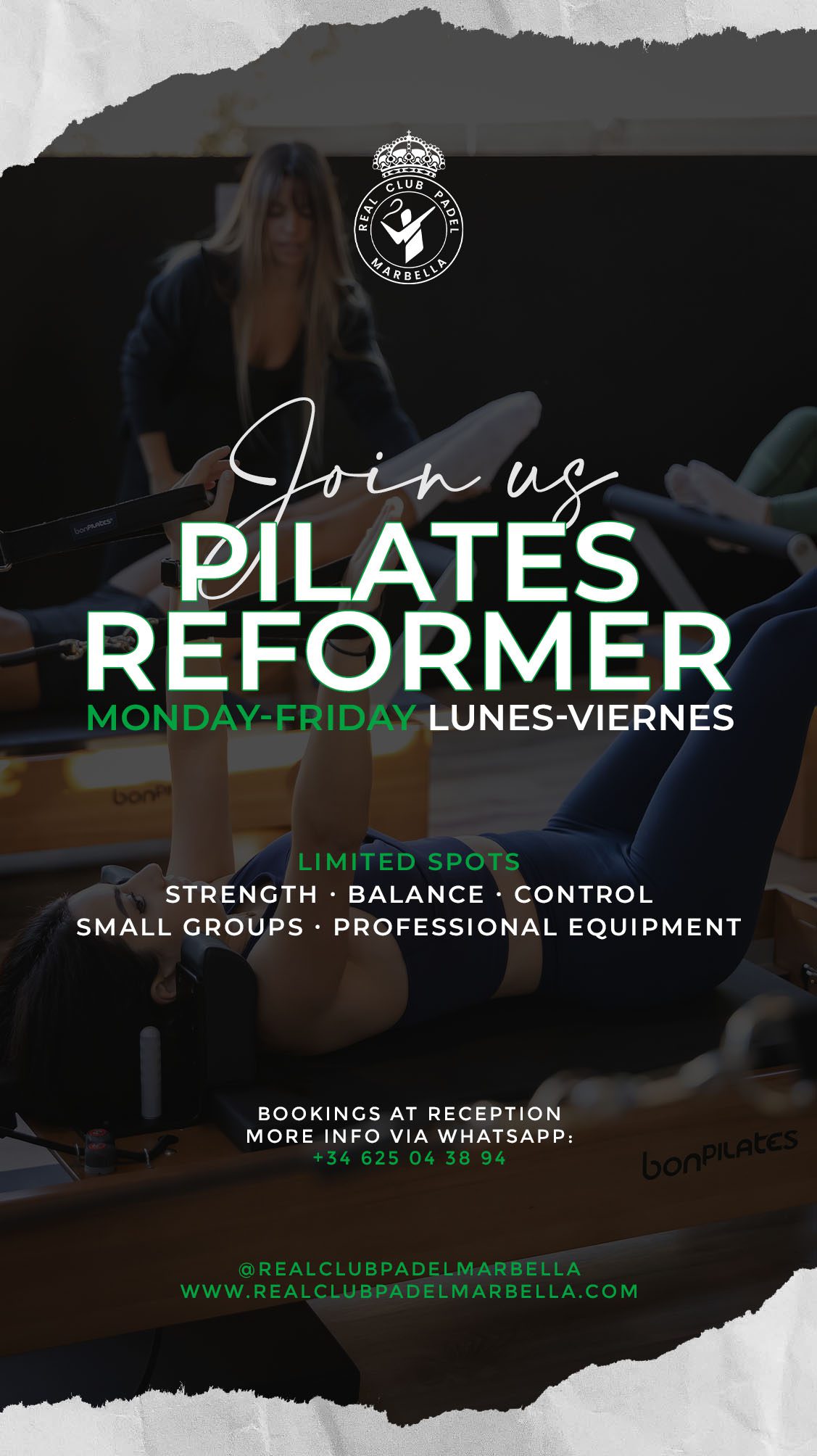 Únete a nuestras clases de Pilates Reformer en Real Club Pádel Marbella y descubre un método de entrenamiento que fortalece tu cuerpo mientras mejora tu equilibrio, flexibilidad y bienestar general.